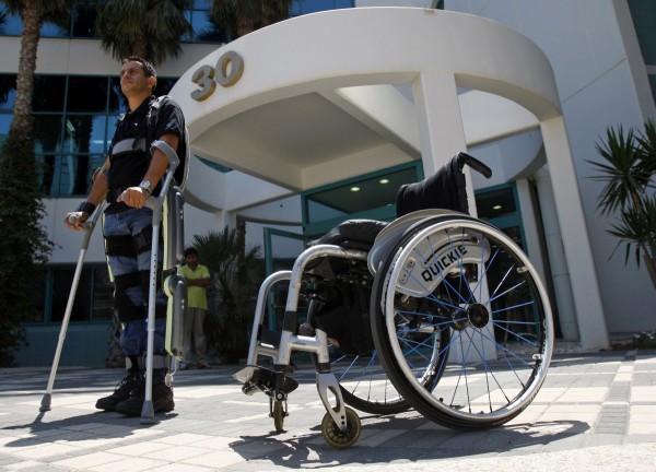 Radi Kaiof stoji pokraj invalidskih kolica uz pomoć elektroničkog egzoskeleta ispred istraživačkog centra u Haifi. Iako su za sada uz njegovo korištenje potrebne štake kao pomoć za održavanje ravnoteže, uređaj nazvan "ReWalk" mogao bi pomoći velikom broju invalida od 2010. godine za kada je najvaljeno puštanje u prodaju. Sastoji se od motoriziranih potpora za noge, tjelesnih senzora i ruksaka u kojem su računalna kontrolna kutija i punjive baterije. (METRO)
