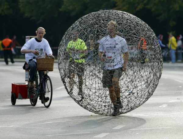 Ovaj sudionik 35. berlinskog maratona odlučio je svoj put učiniti zanimljivijim trčeči u kugli. Ove godine na tradicionalnom maratonu sudjeluje više od 40.000 trkača. (metro portal)