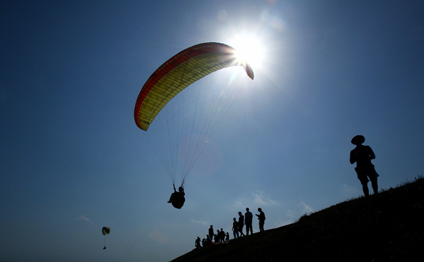 Natjecatelj uzleće tijekom natjecanja u paraglidingu na četvrtom danu Azijskih igara na plaži koje se ove godine odvijaju na Baliju.