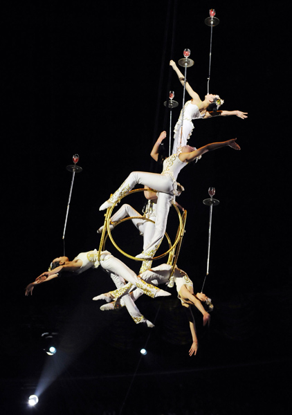 Akrobati iz Wuhan Acrobatic Troupe izvode točku balansiranja na štapu na zračnom prstenu u sklopu 8. međunarodnog festivala akrobatike u Wuhanu. Festival se održava od 25. do 31. listopada, uz sudjelovanje izvođača iz 12 zemalja.