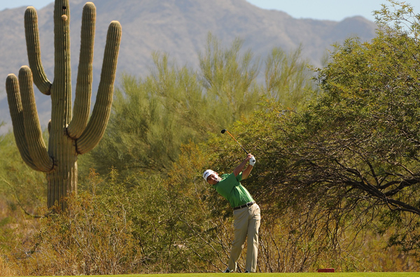 Kevin Sutherland izvodi početni udarac na drugoj rupi tijekom četvrte, posljednje runde Fry's.Com Opena koji se održava u Grayhawk Golf Clubu u Scottsdaleu, Arizona.