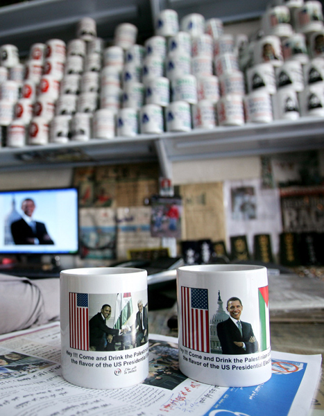 Par sati nakon prvih rezultata izbora u palestinskoj Gazi pojavile su se šalice s otisnutim likom novog američkog predsjednika, za kojeg se nadaju da bi mogao donijeti mir.
