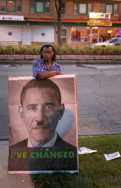 Članovi LaRouche Political Action Committeeja protiv prijedloga zdravstvene reforme koju uporno gura predsjednik Barack Obama, bune se uz vrlo intrigantne plakate. Šalu na stranu, stvar je vrlo ozbiljna jer mu brčići sa slike stoje kao saliveni. Jedino što je teško procijeniti je vuče li više na Adolfa ili Charlieja pa će se za to očito morati dočekati ta stalno spominjana 'promjena' koja nikako da dođe.