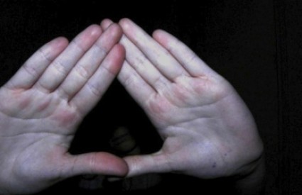 · Ispružite obje ruke ispred sebe, preklopite dlanove tako da prostor između palčeva i prstiju izgleda poput malog trokuta (kao na naslovnoj fotografiji samo trokut treba biti malo manji).