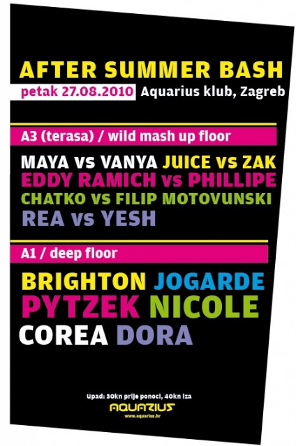 Cijeli Aquarius postat će velika plesna pozornica na kojoj će svoje umijeće pokazati najznačajniji i najaktualniji hrvatski DJ-i! Baš kao u dobra stara vremena naći će se tu pomalo od dnb-a, fidget housa, dubstepa, deep housa, breaksa, dancehalla, UK funkyja, za svakoga po nešto. Zašto kraj ljeta i povratak obvezama ne biste obilježili „đuskajući" na najjačem zagrebačkom plesnjaku - na dance podiju kluba Aquarius.
