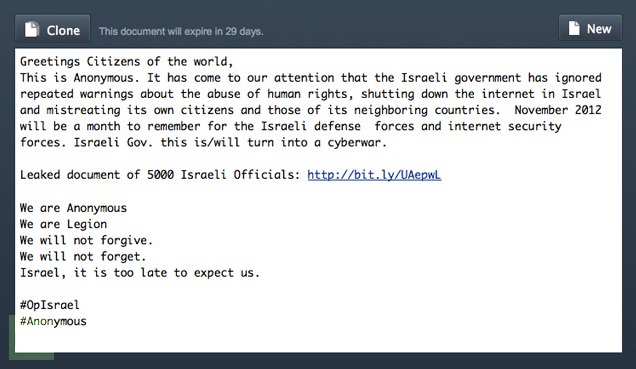 "Primjetili smo da izraelska vlada uporno ignorira upozorenja o kršenju ljudskih prava, gašenju interneta u Izraelu i zlostavljanju vlastitih građana, kao i građana susjednih država. Studeni 2012. godine bit će mjesec za pamćenje za izraelske obrambene snage i osobe zadužene za internetsku sigurnost. Izraelska Vlado, ovo je/postat će cyber rat."