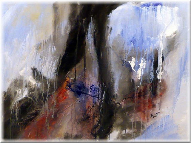 Žunjić kombinira slike s prskajućim strelicama boje koje jure u svim mogućim pravcima ili su to pak nešto mirnije obojane plohe, tamne i nežive, umrtvljene,slabe, s jedva vidljivim znacima života.