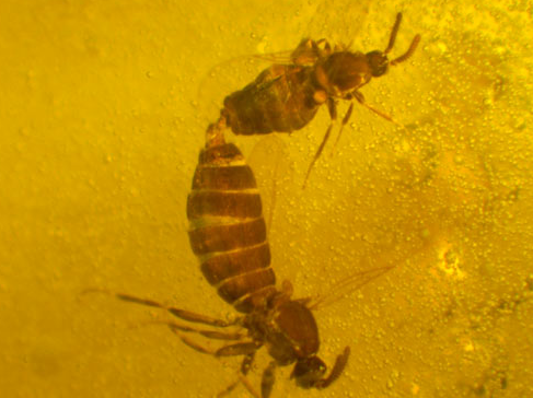 Scatopsidae - ova vrsta muha uglavnom obitava na otpadu i smeću. Na slici je prikazano razmnožavanje dvije takve muhe koje su ostale uhvaćene u smoli drveća prije 20 milijuna godina. Ženka ima kompleksan reproduktivni sustav koji joj omogućuje da uskladišti sjeme mužjaka nakon parenja. Nakon parenja s više mužjaka, te usporedbe kvalitete partnera, ženka odabire sjeme koje je najbolje za oplođivanje njenih jajašca.