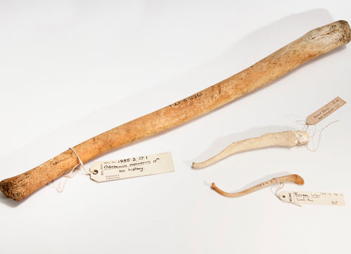 Kost penisa - slika prikazuje kosti penisa morža, njemačke doge i rakuna. Penisna kost, koja pomaže održavanju krutosti tijekom parenja, pronalazi se kod mnogih vrsta sisavaca. Najveća kost pripada moržu, a može imati dužinu i do 75 cm.