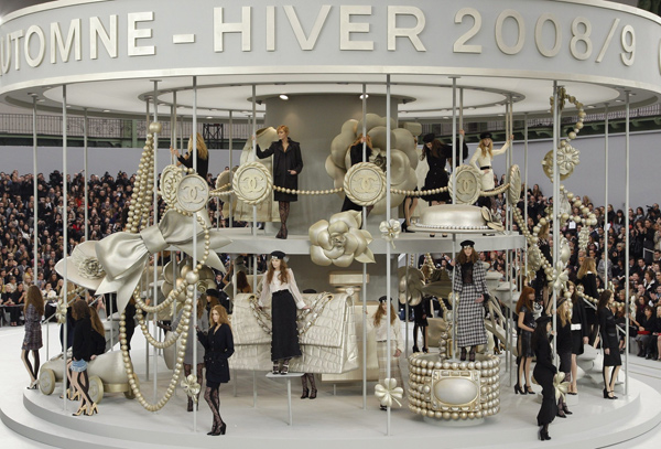 Čak i klasično Chanelovo odijelo, koje je otvorilo reviju, unijelo je dašak mladosti. Scenografija u Grand Palaisu bila je sjajna, i to zahvaljujući vrtuljku s velikim Chanelovim torbicama, perlama, naušnicama, bočicama mirisa i cipelama koje su zamijenile tradicionalne drvene konje. Ledeno siva, crna i bijela dominiraju kolekcijom jesen/zima 2008./09.