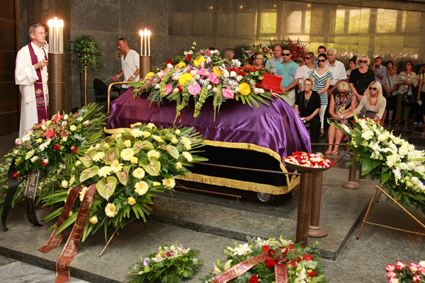 Ispred Hrvatskog društva skladatelja od Dine se oprostio Hrvoje Hegedušić, a u ime Ministarstva kulture Srećko Šestan koji je podsjetio i na glumački talent Dine Dvornika i njegovu malu ali antologijsku ulogu u filmu "Ta divna splitska noć".