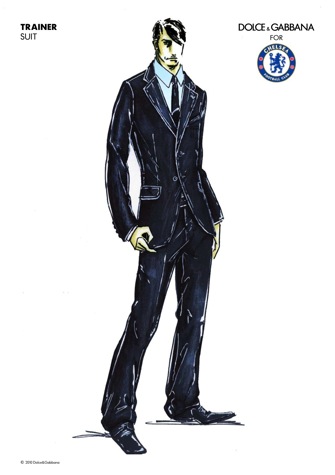 A u tome su talijanske modne kuće iznimno vješte, naročito ako se uzme u obzir njihova duga tradicija šivanja za mišićavu atletsku građu. Jednobojna odijela su, naravno, stilski izražajna, ali ne kičava. Boja im je tamno plava, imaju dva dugmeta i uske revere te precizno uvezen motivi kluba Chelsea na lijevoj strani kod džepa u visini grudi.