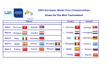 U skupini B igrat će Srbija, Mađarska, Rusija, Njemačka, Grčka i Makedonija. To je odlučeno na ždrijebu koji je večeras održan na Trgu bana Jelačića. Obavljen je i ždrijeb skupina ženskog turnira, a hrvatska reprezentacija svrstana je u skupinu A s ekipama Rusije, Italija i Grčke, dok su u B skupini Španjolska, Mađarske, Nizozemska i Njemačka.