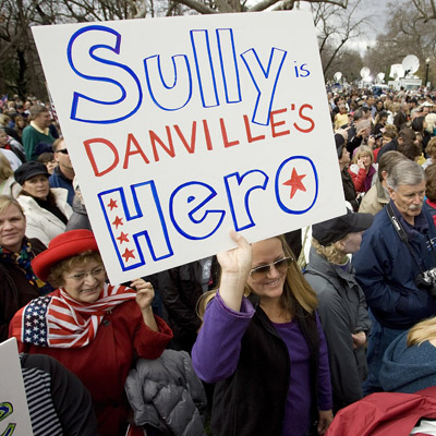 Burnim pljeskom i ovacijama, građani su pozdravili izlazak Sullenbergera na improviziranu pozornicu, nakon nastupa dvaju orkestara i jednog gajdaša, te govora lokalnih dužnosnika i njegove uplakane supruge Lorrie.