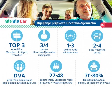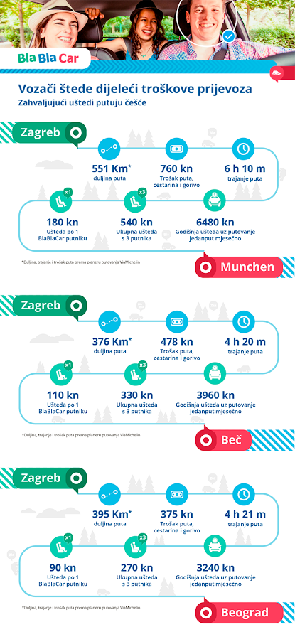 Nedavno su, kažu, napravili malo istraživanje među članovima koji dijele prijevoz prema drugim zemljama kako bi još bolje shvatili njihove potrebe. Najčešća relacija je ona između Zagreba i Munchena, a zahvaljujući dijeljenju prijevoza članovi BlaBlaCara uštede prosječno 70-80% na troškovima putovanja. Zahvaljujući uštedi otkad dijele prijevoz kući putuju čak dva do četiri puta mjesečno.