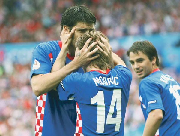 Naši su grači imali otvaranje iz snova. Nakon dvostrukog dodavanja Olića i Modrića u 4. minuti, brzonogi napadač ušao je iskosa u šesnaesterac gdje ga je srušio natrčali Aufhauser. Nizozemski sudac Vink nije dvojio ni sekunde, pokazao je na bijelu točku s koje je precizan bio Luka Modrić.
