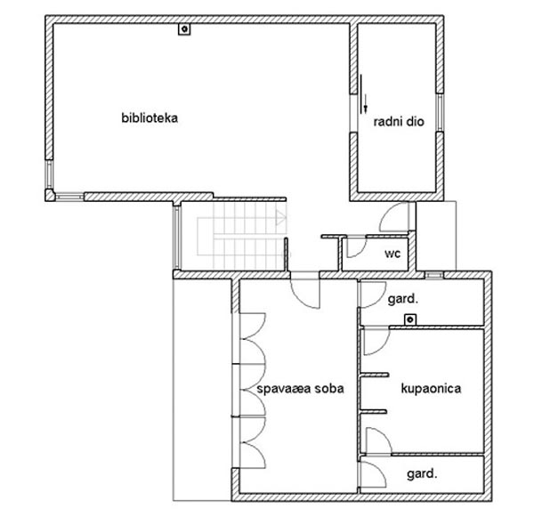 U hodnike i sobe smjestite što više ormara, kako biste oslobodili dnevnu zonu i zonu biblioteke za smještaj samo nužnih sadržaja. Smještaj većeg broja elemenata namještaja stvorili bi osjećaj nereda, jer su stepenište i galerija sasvim dovoljni elementi za naglašavanje prostora.