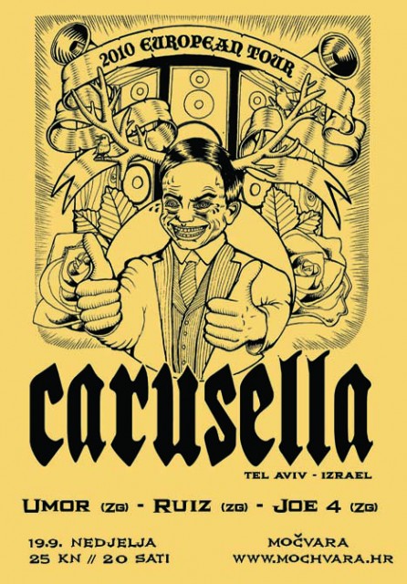 Ove nedjelje, 19. rujna Močvara će u suradnji s Veleposlanstvom Izraela u Hrvatskoj u svojem klubu ugostiti domaće rock'n'roll snage nakon kojih će nastupiti odličan izraelski bend Carusella koji se trenutno špancira Europom na turneji.