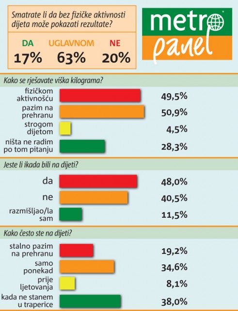 Naša neopterećena populacija tog sitnog viška kilograma, prema istraživanju, rješava se ili fizičkom aktivnošću ili tako što jednostavno više pozornosti pridaje prehrani. I drugo. Polovica je ispitanika bila na dijeti, a nešto manje od polovice nikada! Tek je jedna petina anketiranih razmišljala o dijeti. Rezultati su jasni i ponešto šaroliki, no ipak ukazuju na zdrav stav naših građana, definitivno upućenih u dijetne trendove. Dojam je dakle kako se ili debljinom previše ne zamaramo ili naprosto krijemo da nas višak kilograma opterećuje.