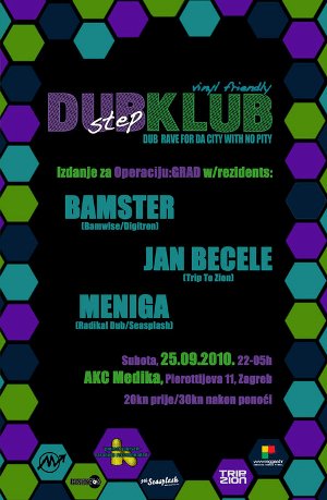 Bamster (Bamwise/Digitron), Jan Becele (Trip To Zion) i Meniga (Radikal Dub/Seasplash) su pokretači i rezidenti DUBstep Klub-a, novog klupskog programa pokrenutog u drugoj polovici prošle godine, promovirajući jedan od trenutno aktualnijih stilova elektronske produkcije, koji se širi poput zaraze i dobija sve više poklonika na globalnoj razini.