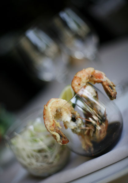 PRIPREMA Najprije ogulite povrće te ga narežite ili naribajte na tanke rezance. Zatim skuhajte tjesteninu, ocijedite i isperite je hladnom vodom. Stavite tjesteninu, rezance od povrća i kavijar od pastrve u veću zdjelu pa ih začinite rižinim octom, sojinim umakom, solju i dodajte sasvim malo sezamova ulja. Oljuštite divovske kozice pa ih zarežite duž repa i izvadite im crno crijevo. Možete ih prvo marinirati u malo sojina umaka i/ili đumbira. Kuhačom razmutite jaje u hladnoj mineralnoj vodi pa dodajte brašno, sve odjednom, i promiješajte tek toliko da se umiješa u vodi. Zagrijte ulje za prženje pa po malo umačite kozice u tempuru i pržite dok ne postanu hrskave. Izvadite iz ulja i stavite na papir za upijanje. Servirati uz soba-salatu ukrašenu kavijarom od pastrve, poprženim sezamom, rezancima povrća i, obvezno, sojinim umakom.