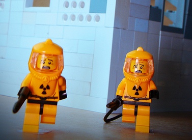 Žuta figurica Lega koja ima opremu za zaštitu od zračenja i paničan izraz lica neodoljivo podsjeća na radnike nuklearke Fukushima koji se već preko mjesec dana bore s nuklearnom katastrofom.