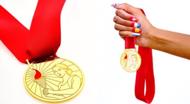 Pozlaćene medalje promjera šest cm od 18-karatnog imaju ugraviranu sliku koja prikazuje menstrualnu čašicu INTIMINA s emajliranom crvenom kapljicom umjesto baklje i plamena. I kapljica i vrpca su u Pantone crvenoj boji pod nazivom Period (Menstruacija). Medalje je izradio draguljar Geoff Murray, kojem stvaranje nakita za olimpijce nije strano.