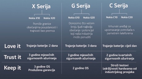 Na vrhu je Nokia X serija, zatim je srednja G serija i početna C serija koje pružaju kvalitetno iskustvo koje potrošači očekuju od europske mobilne tvrtke. Proizvodi koji su napravljeni da traju iznutra i izvana zahvaljujući prepoznatljivoj sigurnostii, vrhunskoj trajnosti i obećanju da će pružiti najnoviji softver, tako da možete dulje zadržati telefon.