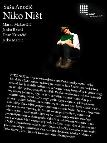 NIKO I NIŠT naziv je urnebesne satirične komedije u proizvodnji Kazališta KNAP. Autor i redatelj predstave je Saša Anočić, isti onaj autor i redatelj koji je izmislio i oživio sad već legendarnog dragog gubitnika Gospodina Lojtricu. Dok se gospodin Lojtrica hvatao u koštac s nemanima i opakim bolestima zdravstvenog sustava naš novi heroj sukobit će se s onima koji djeluju u pravosudnom sustavu. Nakon što mu u njegovom rodnom malom mjestu, gdje je kanio sretno proživjeti svoj život, oduzmu pravo na obiteljsku kućicu, Pravdu odlučuje potražiti u Velikom gradu. Kako će se Neiskvareni Niko snaći u raljama Velegrada i da li će istjerati pravdu na Čistac ostaje Vam vidjeti na sceni KNAP-a. Jedinstvenu redateljsku viziju Saše Anočića u nezaboravnim multipliciranim ulogama iznijet će Vam na vidjelo briljantni Marko Makovičić, Jerko Marčić, Janko Rakoš i Dean Krivačić. Ne propustite!