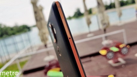 Poleđina smješta senzor otiska prsta bliže gornjem rubu i prst prirodno naliježe na površinu. Čitač nema pogrešaka pri prepoznavanju. Također su drugi vidljivi elementi na stražnjoj strani zadržani duž središnje osi prema dolje kako bi se poboljšala estetika. Ti elementi su logotip, oznaka Android One, dodatni mikrofon i dual kamere. One malo vire od površine. Desno od njih je prilično moćna bljeskalica s diodama različitih boja.