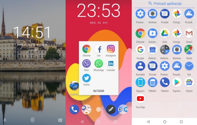 Imate tipične opcije za upravljanje količinom informacija koje se prikazuju dolaznim porukama, što znači da ih možete blokirati ili pogledati cijeli sadržaj kada stignu. U gornjem redu sučelja, koje prikazuje popis aplikacija, prikazuje se 5 najčešće korištenih za brži pristup. Početni lijevi zaslon je rezerviran Google Now. Web preglednik je Chrome, a tipkovnica je Googleova (Gboard).
