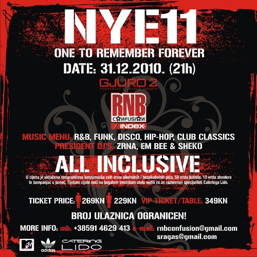 Ako ste mislili da je 2010-ta bila plesna, zamislite kakva će tek biti nadolazeća godina jer u nju vas uvodi ekipa RNB Confusion-a. RNB Confusion će dočekom Nove Godine proslaviti jednu uspješnu godinu punu dobrih partyja, veselih druženja, ostvarenja dugo čekanih gostovanja, ali i ući u devetu godinu svog postojanja.