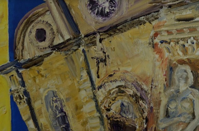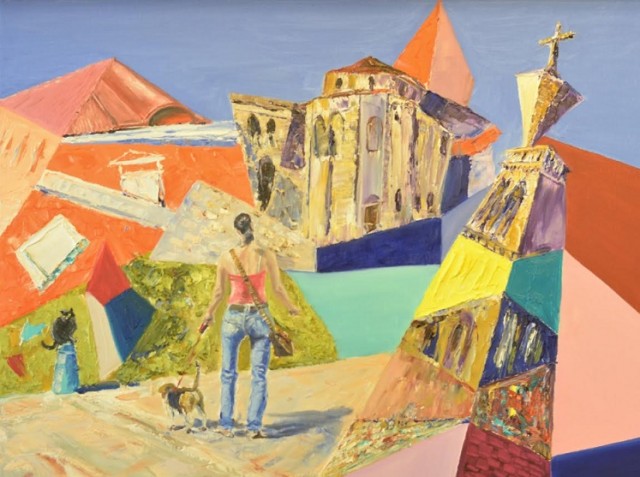 Naime, pred nama je ciklus nadrealnih motiva s centralnom figurom šetačice i psa, koja se kreće zamišljenom stazom između povijesno umjetničkih artefakata ili samo njihovih fragmenata, mirno i upitno promatrajući prohujala lica vremena zabilježena trudom ljudskih ruku i srca.