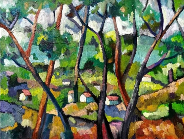 Čisti, neprijeporni dijelovi krajobraza u potpunosti pripadaju prepoznatljivom rukopisu slikara, skupina sukladnih ploha boje, koje nastavaju i druge slike iz novijeg opusa, čineći čvrstu pozadinu, temelj na kojem se uzdiže nekoliko vitkih stabala, koja su vrlo vjerojatno do malo prije nalikovala tajanstvenoj skupini zatečenoj u veseloj vilinskoj igri, četiri mlade djevojke opijene plesom. A sada su to izvijena, poput zanosnih tijela, tanka stabla u mističnoj šumi.