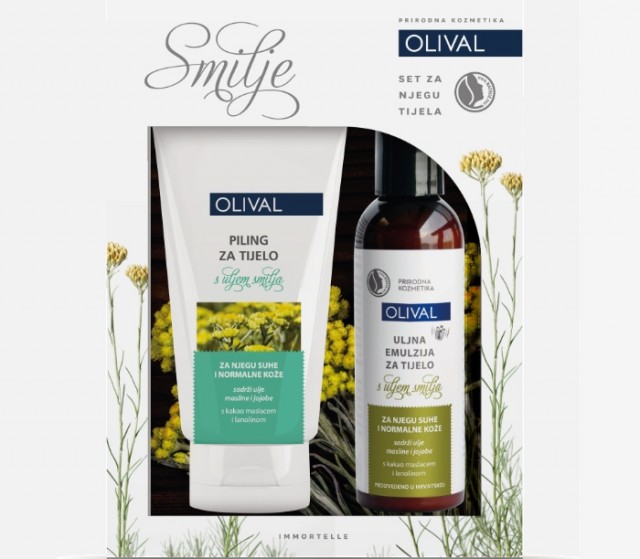 Olival Piling kremu za tijelo s uljem smilja možete pronaći u setu s Uljnom emulzijom za njegu suhe kože, koji će vas razveseliti i sadržajem i pakiranjem te je ujedno i super dar dragoj prijateljici.
