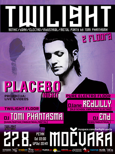 Najdugovječniji, najmračniji, najbolji i najveći alter party u Hrvata, a i šire, Twilight Party, nakon ljetne pauze ponovo će se održati u centru alternativne kulture, zagrebačkom klubu Močvara. Tema ovog partyja će biti londonska alter rock atrakcija Placebo, pa će tako biti projekcija spotova i live snimaka, kao i presjek audio radova grupe. Nakon toga će vas Tomi Phantasma provest kroz audio video twilight putovanje i vrtiti mračne hitove od old school gothica i darkwavea, preko old school ebma i industriala do gothic metala i punk rocka.