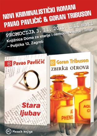 Sutra će se u 11 sati u Knjižnici Doma za starije i nemoćne osobe (Trnje, Poljička 12) u Zagrebu predstaviti dva iskusna autora s dva nova kriminalistička romana. Riječ je o Pavlu Pavličiću i romanu 'Stara ljubav' te Goranu Tribusonu sa 'Zbirkom otrova', a oba su romana izdana pod logom izdavačke kuće Mozaik knjiga.