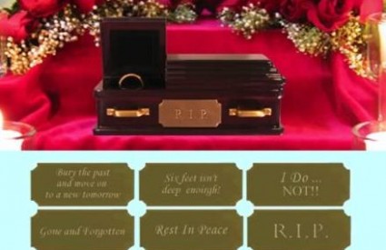 Kakav god bio da bio, vaš je brak zaslužio da ga dostojno pokopate. Ima li boljeg načina da to učinite od ovog prekrasnog mini lijesa? Na stranici WeddingRingCoffin.com možete kupiti ne samo lijes, već i svu dodatnu opremu koja uz to ide, a možete izabrati i tekst koji će stajati na vrhu lijesa - „Ovdje leži brak Ivane i Martina. Oprostite što ne ustajem."