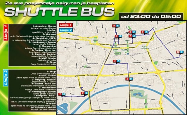 U cijenu ulaznice od 40 kuna, uključeni su besplatni shuttle busevi koji će cijelu noć kružiti gradom i posjetitelje prevoziti od kluba do kluba, kao i poklon bon studija FASHION ADDICT u vrijednosti od 50 Kn koji svi posjetitelji mogu koristiti do 01.06.2010. (vrijedi samo uz predočenje ulaznice).