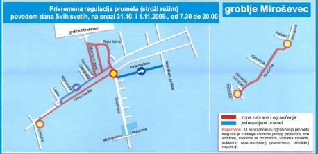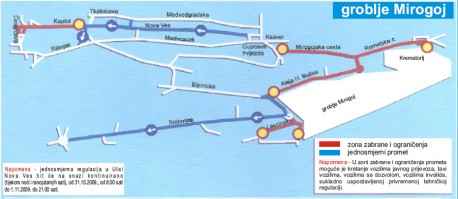 Privremena regulacija prometa i režim javnog prijevoza u zonama glavnih gradskih groblja, MIROGOJ i MIROŠEVEC, te na pojedinim lokacijama vezanim uz prilaze grobljima i uz organizaciju ZET-ovih linija, kao što su zone KAPTOL, SREBRNJAK i druge, provoditi će se od petka, 29. 10. do ponedjeljka, 02. 11. 2010. godine, a u zoni groblja MARKOVO POLJE, biti će na snazi od 23. 10. do 02. 11. 2010.