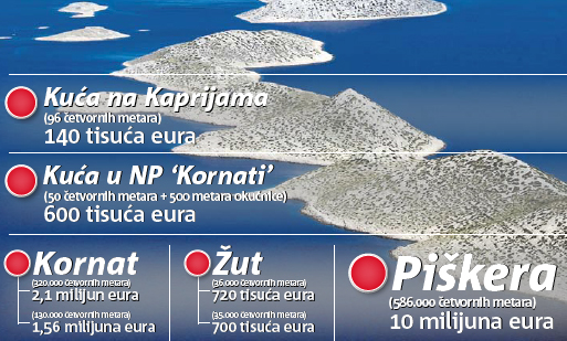 Ponuda parcele na Piškeri od čak 586 tisuća četvornih metara s dvije kuće od 100 i 120 četvornih metara preko puta ACI marine na susjednom otoku Panituli, privukla je veliki broj znatiželjnika ali i otkrila da se trenutačno nudi na prodaju više od 20 otoka, te otočni posjedi i kuće na Kornatima, u NP ‘Kornati’ i izvan njega. Ukupna vrijednost nekretnina na Kornatima, čiji je popis veoma dugačak, prema traženim cijenama iznosi gotovo 130 milijuna kuna. Riječ je u pravilu o vrlo velikim parcelama pa su konačni iznosi golemi, iako se cijene četvornog metra za zemljište na kojemu nije dopuštena nikakva gradnja kreću od pet do 20 eura.