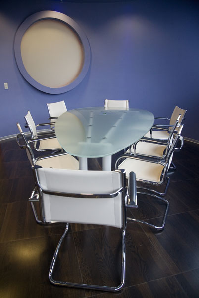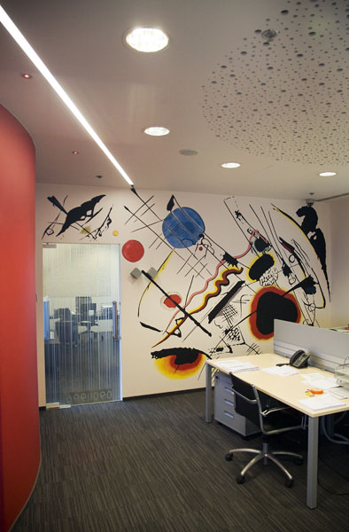 Cijeli prostor je pravokutan, glavni elementi svakodnevne uporabe također su pravokutnog oblika - stol, računalo, monitori, telefoni..., pa kada se u taj ortogonalni prostor ubaci kakav okrugli element, cijeli prostor dobije neku vrste apstraktne dinamike. Dodatnu fluidnost naglašava 11-metarsko rasvjetno tijelo dijagonalno postavljeno preko cijelog ureda. Sva vrata u prostoru su staklena s dezenom bar codea, čineći polupropusnu membranu između prostorija, zavjesu na moderan način, koja se krije u samim vratima.