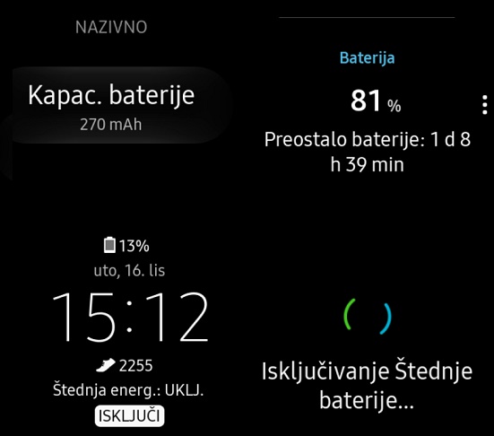 Uz zadano korištenje dva dana možete biti mirni. Želite li razvući na tri dana, u mojoj procjeni, to bi bilo ostvarivo uz neki od štednih načina rada. Samo u tom slučaju imate gadget s ograničavajućim značajkama. Međutim, ako sam imala uvijek uključen prikaz vremena na zaslonu, koristila GPS i vodila razgovore preko sata, morala sam puniti bateriju u večernjim satima.