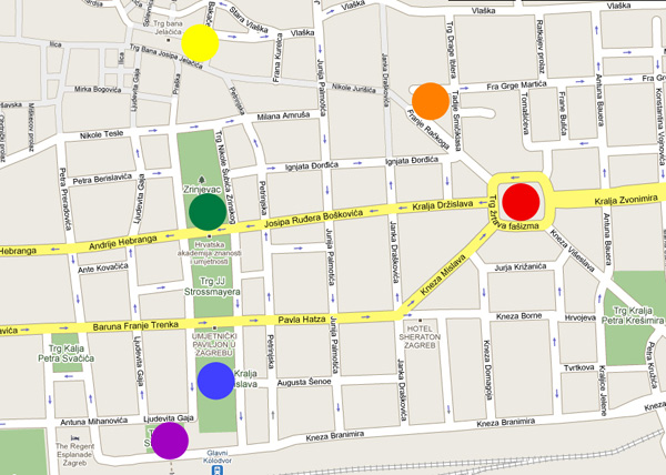 Crvena - "Džamija", narančasta - Trg hrvatskih velikana odnosno "Burza", žuta - Manduševac, zelena - Zrinjevac, plava - "Tomislavac", ljubičasta - Trg Ante Starčevića ispred "Esplanade" - ljubičasta.