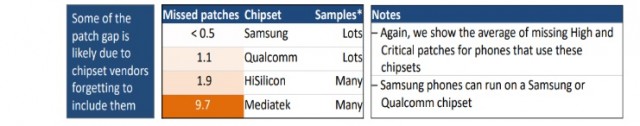 I ovoga puta, Samsung se pokazao kao odgovoran proizvođač. Uređaji pogonjeni Samsung Exynos čipsetom nisu propustili više od 0,5 ažuriranja godišnje. Pametni telefoni čija je hardverska baza Qualcomm mobilna platforma, u prosjeku gube samo jedno ažuriranje. Tajvanski proizvođač MediaTek Inc, minimalno brine o sigurnosti mobilnih uređaja sa svojim komponentama. Izdaju nadogradnje zapravo samo dva puta godišnje, a sve ostalo je obmana. U pravilu, stručnjaci naglašavaju kako "prazna" ažuriranja se primjećuju najviše upravo na pametnim telefonima na temelju MediaTek procesora.