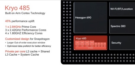 Snapdragon 855 temelji se na TSMC-ovom procesu od 7nm. Dobio je tri klastera s Kryo 485 jezgrama koji se razlikuju u smislu ARM arhitekture i satnog rada: 1 x Cortex-A76 frekvencije 2,84 GHz + 3 x Cortex-A76 frekvencije 2,42 GHz + 4 x Cortex-A55 frekvencije 1,8 GHz za uštedu energije. Svaka jezgra ima zasebnu L2 predmemoriju i dijeli L3 predmemoriju. Što se tiče memorije, podržane su 4 x 16 bita LPDDR4X do 2133MHz.