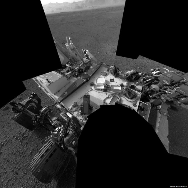 Fotografija je kompozicija stotinjak manjih fotografija slikanim širokokutnom kamerom niske rezolucije. U sredini se vidi Mount Sharp koji se nalazi u centru kratera Gale u koji je rover sletio. Dio misije Curiosityja je i istražiti stijene te planine.