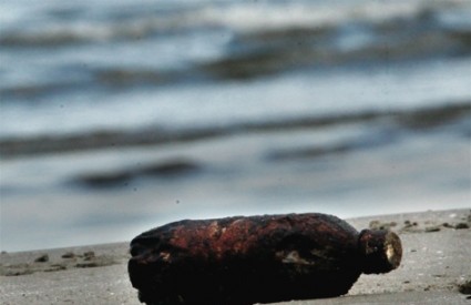 Plastična boca prekrivena naftom leži na obali Grand Islea, a nafta se vidi i u pozadini.