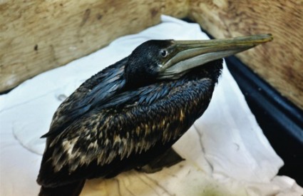 Smeđi pelikan prekriven naftom čeka na čišćenje u Centru za rehabilitaciju divljih životinja u mjestu Buras u Louisiani.