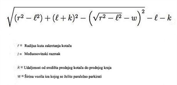 Formula počinje korištenjem radijusa kruga okretaja automobila te međuosovinskim razmakom vozila. Tada, koristeći duljinu 'nosa' automobila sa širinom susjednog automobila, formula izračunava koliko je prostora potrebno da biste parkirali automobil.